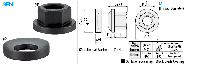 | หมายเลขชิ้นส่วน | M x P (ขนาดเกลียว × พิทช์) | B | C | D | E | G | H | I | น้ำหนัก แคลมป์ยึด ดับด้วย HRC 30 ± 5 ซึ่งมี วัสดุ คือ S45C | |
