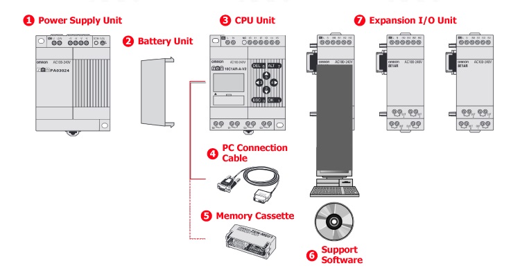 | จำนวนจุดควบคุม I/O สูงสุด | 44 จุด—หน่วย CPU พร้อม 20 จุด I/O: 12 อินพุต และ 8 เอาต์พุต *1 หน่วยขยาย I/O: 4 อินพุต และ 4 เอาต์พุต ต่อหน่วย × 3 หน่วย |