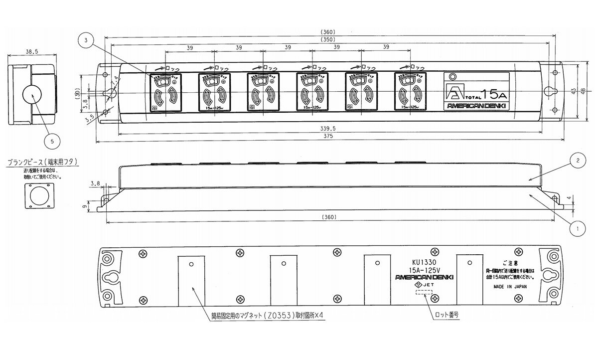 ราง ปลั๊กพ่วง ที่สามารถใช้สำหรับการ อุปกรณ์สายไฟ ฟีด และมี ทนความร้อน การติดตาม ฯลฯ [คุณสมบัติ]·มีโครงสร้างที่สอดคล้องกับสายเคเบิล VCT 3.5 มม. · เต้ารับ และ เคส เรือน แบบฝัง ตัวทำจาก วัสดุ ที่ทนความร้อน ทนต่อการติดตาม ฯลฯ · ใช้ ไนล่อน เรซิ่น ที่มี ไม่ลุกติดไฟ (UL94V-0) ซึ่งไม่มี สเปค อันตราย · มี 6 ช่องเสียบ. · การต่อลงดินแบบ 2 ขั้ว 3 ขดลวด / พิกัด 15 A และใช้งานได้สูงสุด 15 A · รองรับการใช้งาน กับสาย แบบใช้ไฟฟ้า ต่างๆ และสายเคเบิลต่างๆ · ขนาดการประมวลผล เทอร์มินอล สายไฟ (ความยาว ถอด) จะเท่ากันสำหรับสายไฟ คอร์/แกน ทั้ง 3 เส้นที่ด้าน พาวเวอร์ซัพพลาย และด้านป้อน (40 มม.) · สามารถติดตั้ง แม่เหล็ก เสริม ปลั๊กอิน สี่ตัว (Z0353) ที่ด้านหลังได้ · ช่วยให้มีสไตล์และ ประหยัดพื้นที่ [ใช้]·เมื่อคุณต้องการใช้ ปลั๊กพ่วง หลายอันในบรรทัดเดียวกัน คุณสามารถเชื่อมต่อ ปลั๊กพ่วง เข้ากับ อุปกรณ์สายไฟ ฟีดได้อย่างอิสระ