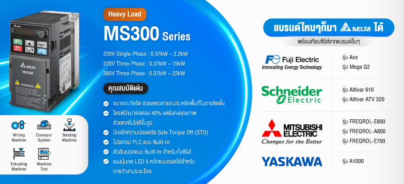 MS300 ซีรีส์ของเดลต้าเป็นไดรฟ์ อินเวอร์เตอร์ มาตรฐาน ขนาดกะทัดรัดที่สืบทอดเทคโนโลยีไดรฟ์ที่เหนือกว่าของเดลต้า รองรับ อุปกรณ์ควบคุม มอเตอร์ ทั้ง IM และ PM เพื่อ ความยืดหยุ่น การใช้งาน และมี กลไก ความปลอดภัย STO นอกจากนี้ ยัง แบบฝัง รวมถึงความสามารถ PLC สำหรับความต้องการในการเขียนโปรแกรมอย่างง่าย ร่อง ระบบสื่อสาร สำหรับการ์ด ระบบสื่อสาร ต่างๆ และ พอร์ตเชื่อมต่อ USB เพื่อให้การอัพโหลดและดาวน์โหลดข้อมูลรวดเร็วและง่ายดาย ประหยัดพื้นที่ ข้อต่อลด เวลาในการติดตั้งและ อุปกรณ์สายไฟ ขณะเดียวกันก็ให้ ระบบ ที่มีประสิทธิภาพและความเสถียรสูง ทั้งหมดนี้รวมอยู่ในซีรีส์ MS300 โดยมีขนาดไดรฟ์ลดลงถึง 40%
