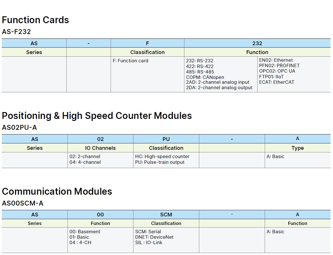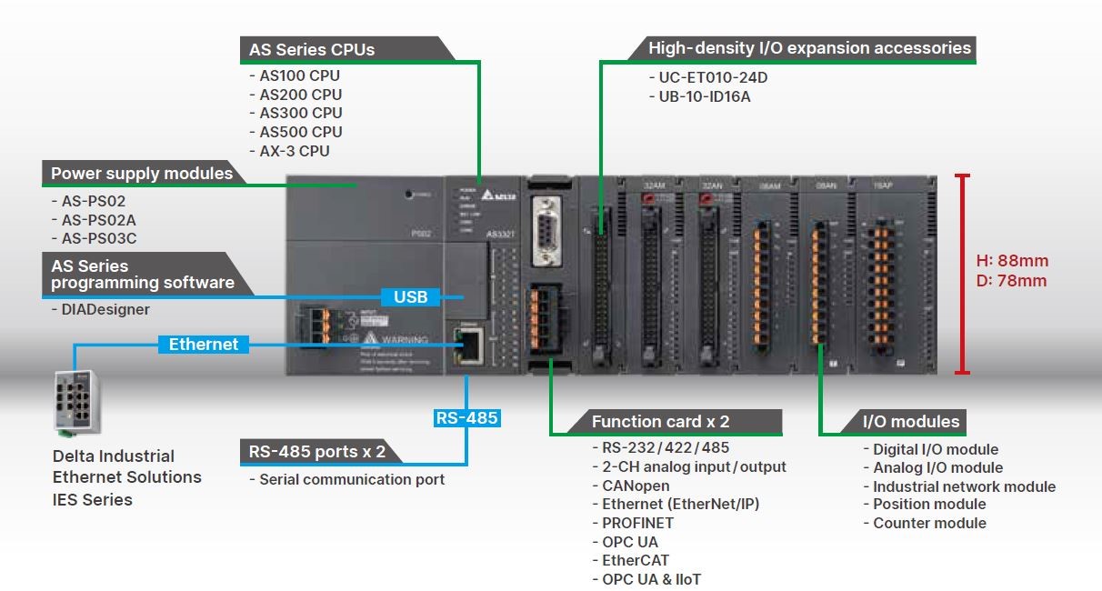 AS-Series PLC รีส์ Delta Compact Modular Mid-range เป็น ตัวควบคุม เอนกประสงค์ประสิทธิภาพสูงที่ออกแบบมาสำหรับอุปกรณ์อัตโนมัติทุกประเภท มีซีพียู SoC 32 บิตที่เดลต้าพัฒนาขึ้นเองเพื่อความเร็วในการประมวลผลที่เพิ่มขึ้น (40,000 ขั้น/มิลลิวินาที) และรองรับโมดูลขยายสูงสุด 32 โมดูลหรืออินพุต/เอาต์พุตสูงสุด 1,024 รายการ ซีรีย์ AS ให้ อุปกรณ์ควบคุม การวางตำแหน่ง ที่แม่นยำสำหรับแกนสูงสุด 8 แกนผ่านเครือข่ายการเคลื่อนที่ CANopen และแกนสูงสุด 6 แกนผ่าน อุปกรณ์ควบคุม พัลส์ (200 kHz) มีการใช้กันอย่างแพร่หลายในอุปกรณ์อัตโนมัติที่หลากหลาย เช่น การผลิตอุปกรณ์อิเล็กทรอนิกส์ การติดฉลาก การบรรจุอาหาร และเครื่องจักรสิ่งทอ