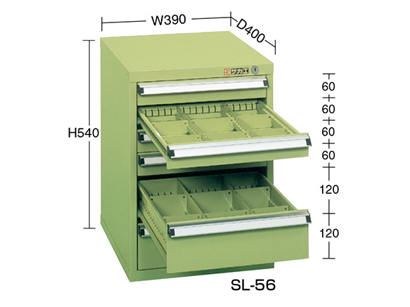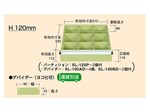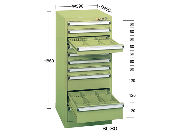มี 4 ความสูงให้เลือก: 420 มม. 540 มม. 660 มม. และ 860 มม. สามารถเลือกขนาดได้ตามการใช้งาน แต่ละลิ้นชักมี 2 พาร์ทิชั่น/ฝากั้นพื้นที่, 4 วงเวียน (W99) และ 2 ชิ้น (W117)