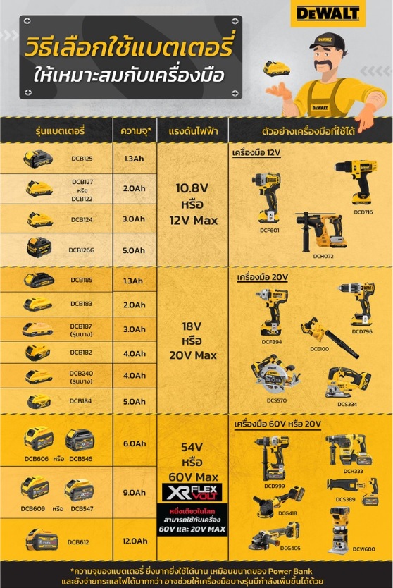 วิธีเลือกแบตเตอรี่ให้เหมาะสมกับ เครื่องมือ อุปกรณ์แหล่งจ่าย Dewalt