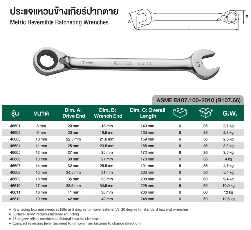 - ก้านโยก โยกถอยหลังแบบฝังช่วยให้ผู้ใช้เปลี่ยนทิศทางโดยไม่ต้องถอดประแจ